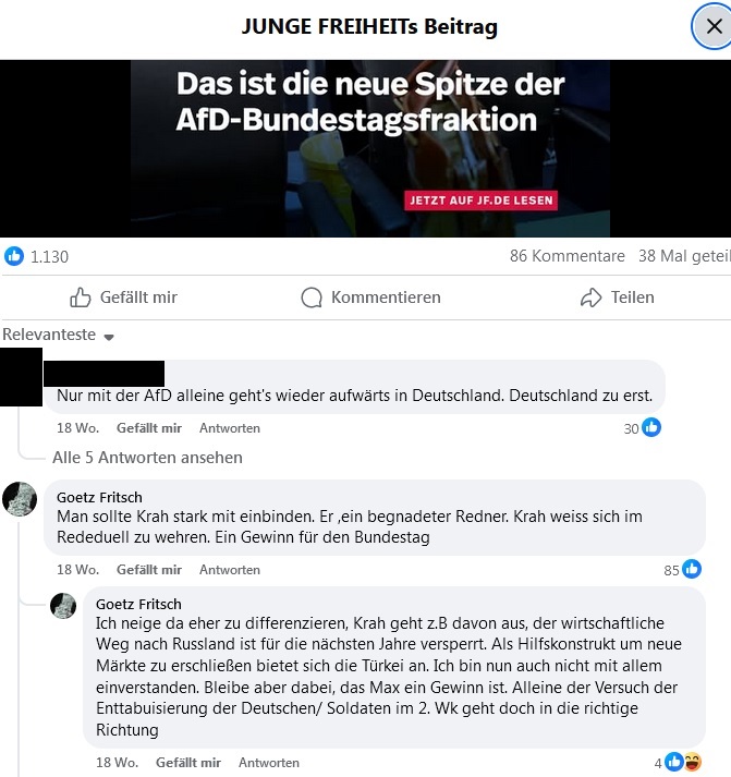 Screenshot Facebook: Götz Fritsch über Krah unter Beitrag des rechten Mediums „Junge Freiheit“